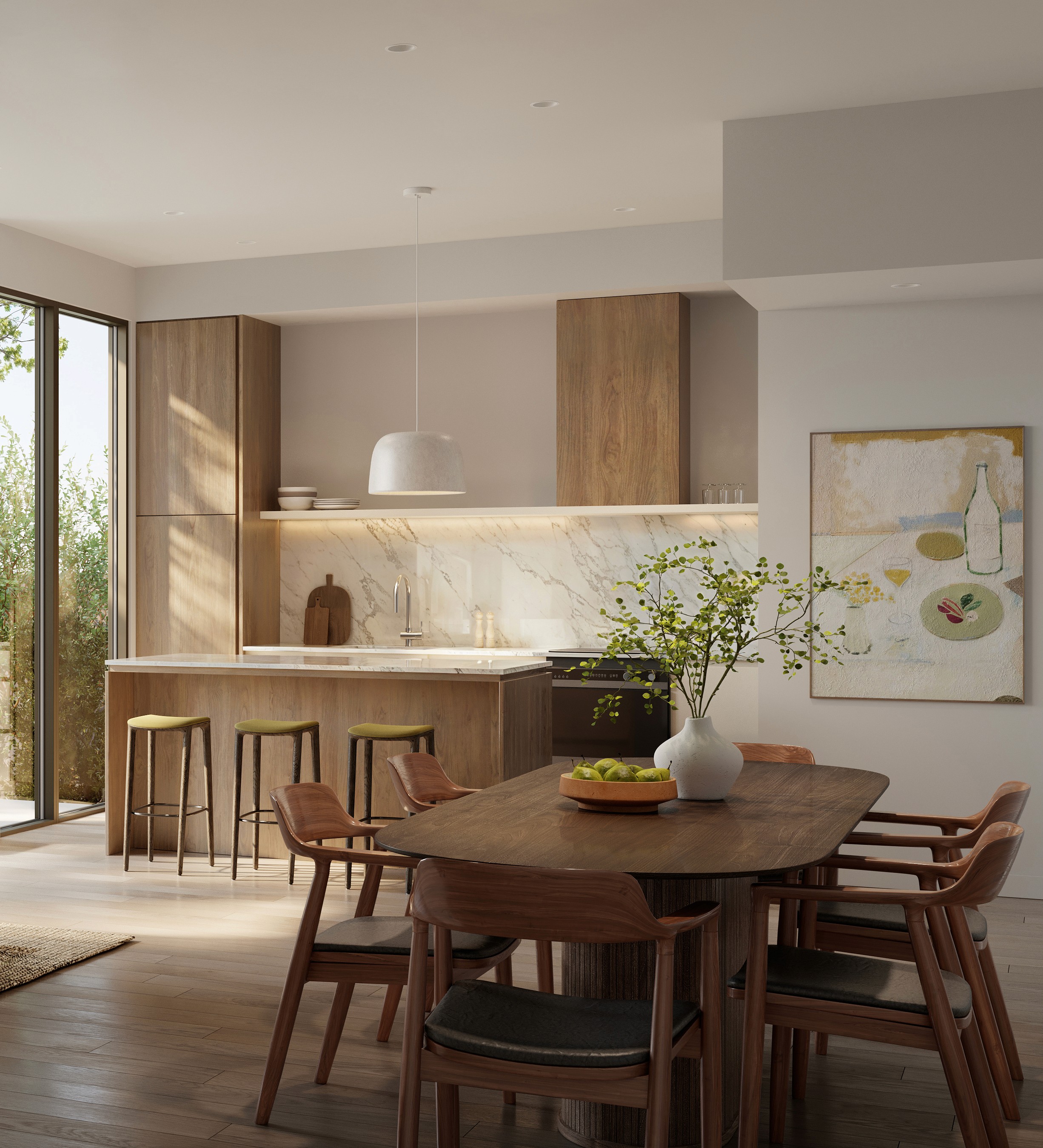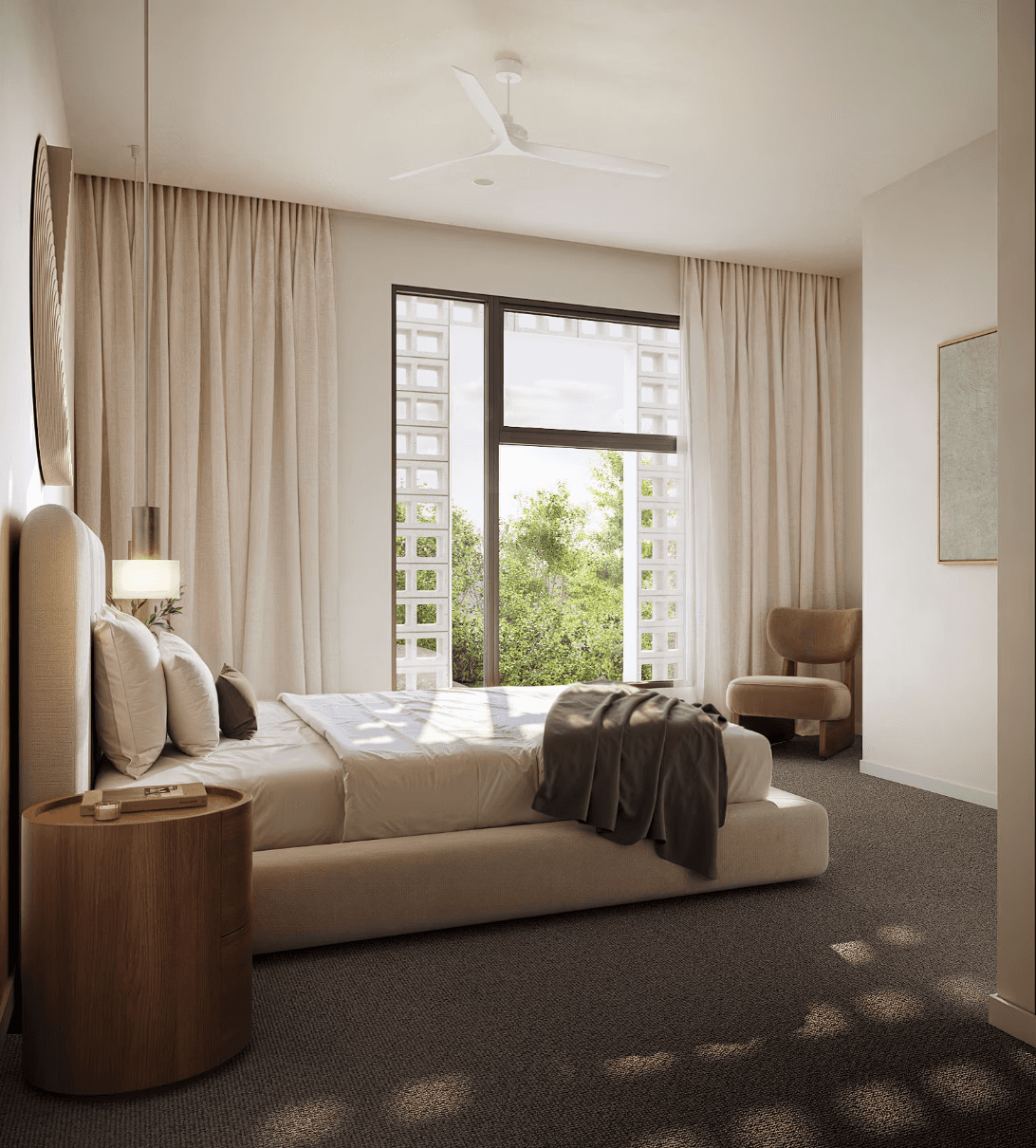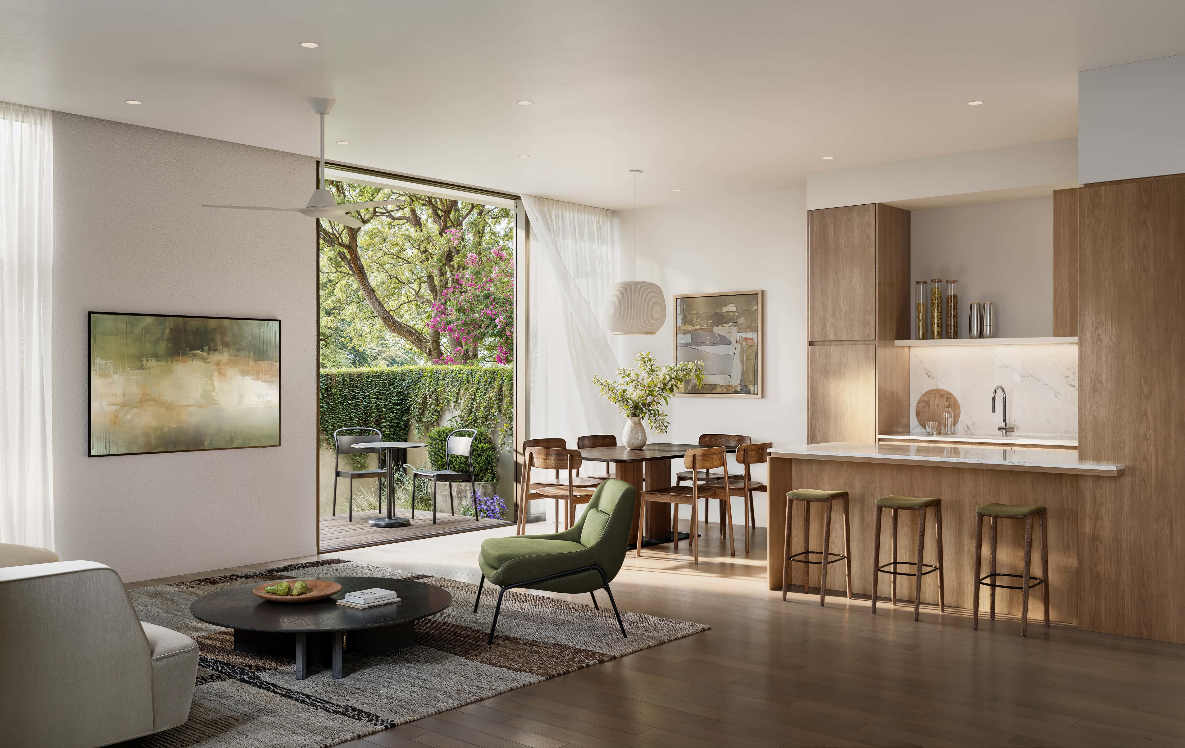 Each residence has been thoughtfully designed to blur the lines between interior and exterior and beyond to Fisher Park. Landscaped and thoughtfully curated by renowned designer Sanchia Hovey, founder of Greenjoy, soft landscaping complements the mature canopies of Burr Oak, Chinese Elm, and River Red Gum in Fisher Park, anchoring each home in nature at its most refined. Open-plan living areas, designed as seamless extensions, flow effortlessly to the residences courtyards, and beyond creating a natural, seamless connection to the surrounding landscape allowing life to flow naturally.